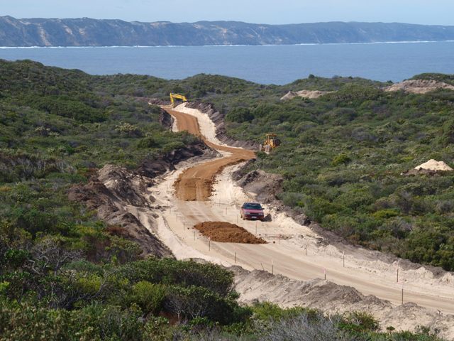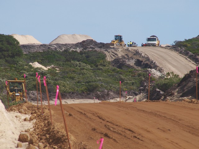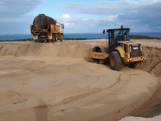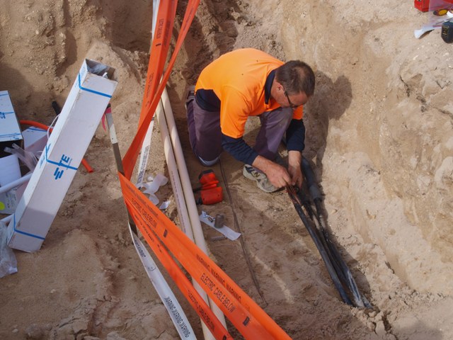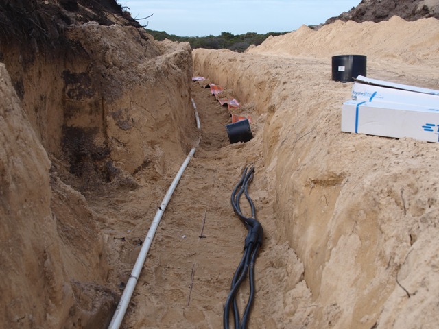 Trenching and laying of the cables between the turbines and the switchroom. The communication cables are in conduits, the earthing is bare and the power cables, one per phase will be under protective safety covers.